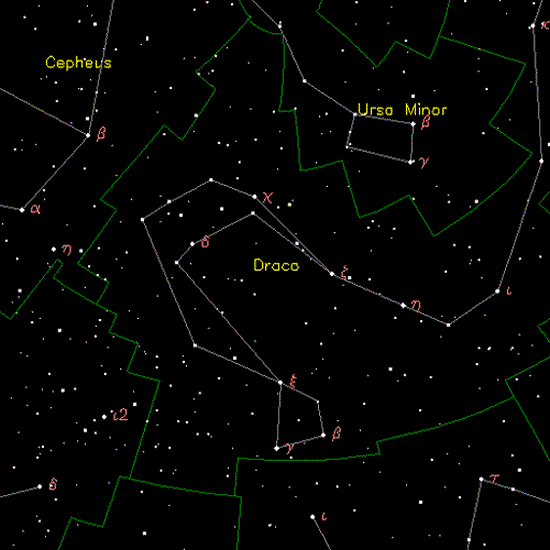 天龙座(Draco)位于北冕座以北,看起来它的确像一条蛟龙往往曲曲地盘旋在大熊座、小熊座与武仙座之间,所跨越的天空范围很广。高昂的龙头紧靠武仙座,由4颗星组成,构成一个四边形。它是拱极星座,在北半球四季可见。每年5月24日子夜天龙座的中心经过上中天。