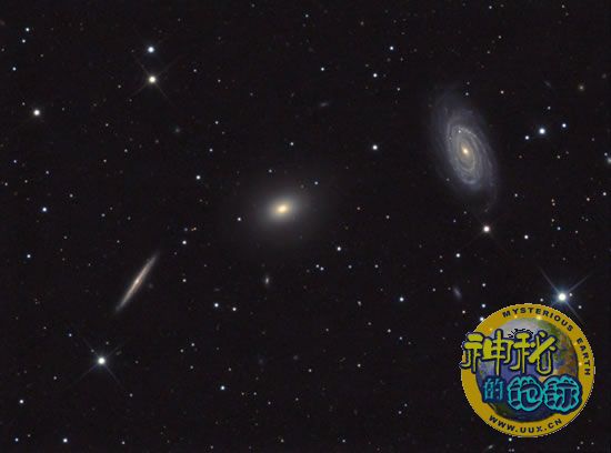 天龙座还有一个著名的星系群,常被称为NGC5985或天龙座群,从左至右分别是NGC5985、椭圆星系NGC5982和NGC5981,通常在一个望远镜视野内就能同时看见它们,因为它们的宽度只比满月的一半要多一点而已。这群星系太小了,所以不能算作是星系团,而且它们也没有被归类成一个致密群,这些星系位于距离地球大约1亿光年远的地方。用光谱仪仔细研究过正面对着我们的螺旋星系NGC5985后,天文学家发现它的核心在某些波段有很强的辐射,因此它也被归类为西佛星系,是一种活跃星系。天龙座三星系虽然并不像其它紧密星系群那么出名,不过它们在视觉上的强烈对比,让它们成为天文摄影爱好者常常拍摄的对象之一。在这张精彩的深度曝光影像中,还可以看见昏暗的更遥远的背景星系。