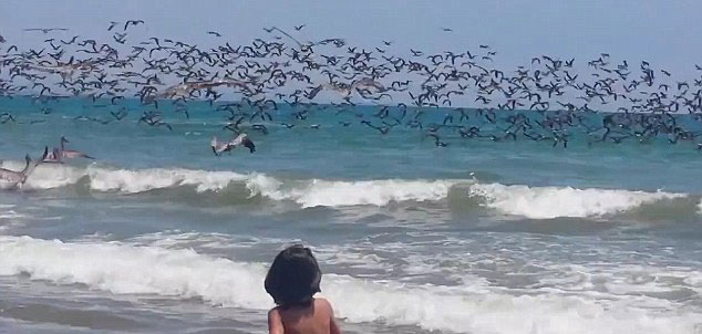 成千上万只鹈鹕俯冲至厄瓜多尔的一个旅游沙滩捕食沙丁鱼,游客们面对突如其来的情况不是所错。当鹈鹕俯冲到沙滩上时,一位母亲迅速地抓住孩子,远离那些饥饿的鹈鹕。但是鹈鹕好像对人类并不感兴趣,而是径直地飞往沙丁鱼分布的海岸区域。