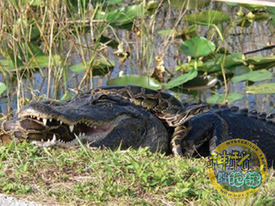 2005年10月,在美国佛罗里达州的大沼泽地国家公园一个非常边远的角落里,人们意外发现了一条大蟒蛇和一条鳄鱼的尸体。蟒蛇有4米长,鳄鱼有2米长,蟒蛇身体中部裂开一个大洞,鳄鱼的尾巴和两个后肢从这个洞中伸了出来。根据分析,这条蟒蛇和鳄鱼曾经过一番厮杀,后来,蟒蛇张开大口活吞整条大鳄鱼,而鳄鱼在窒息死亡前,用身上的尖锐部分把蛇肚子“撞破”。