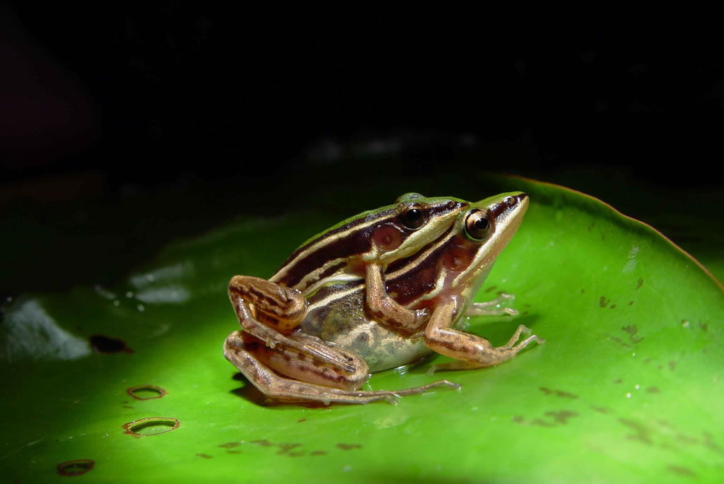 台北赤蛙,母蛙与公蛙(上)数量比例悬殊,野外繁殖数量逐年锐减,令人忧心。照片:动物园提供