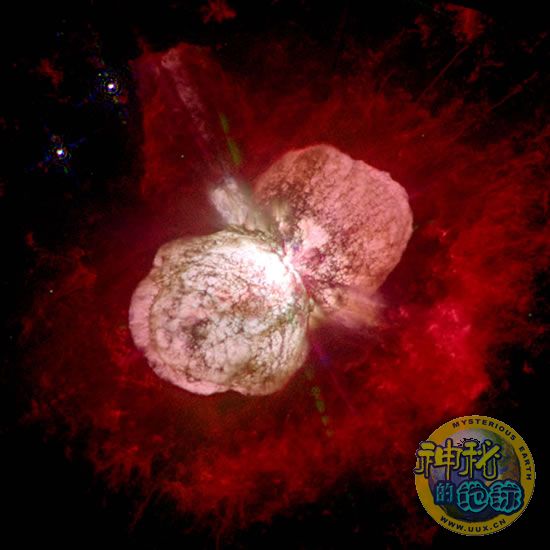Eta Carinae (η Car)是一颗曾经在1843年猛烈爆发过的恒星,是原始的“亮蓝变星”(LBV),后者为非常大的恒星在一次超新星爆炸中、在脱掉其大部分物质并可能导致自身毁灭时所形成的一种类型的天体。LBV喷发的原因尚不清楚。现在,Nathan Smith报告了对在η Car周围的极快核处理物质(比以前所观测到的任何核处理物质都要快)的观测结果。这种快速物质的动能大致是19世纪那次事件的动能的两倍,它表明,最初的爆炸释放了一个冲击波,现在该冲击波正在巨大喷出物前面传播。因此,η Car的外壳现在像一个低能超新星残体。
