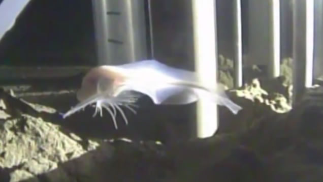 参加研究计划的科学家发现的这个奇特生物据信是“狮子鱼”,“当它游泳时,看起来像有个奇怪的卡通狗鼻子背后浮动着湿纸巾。”