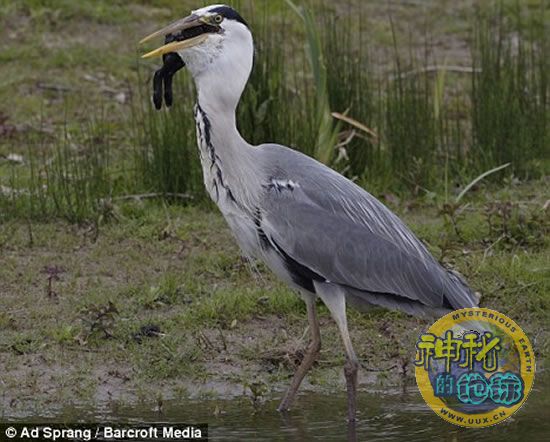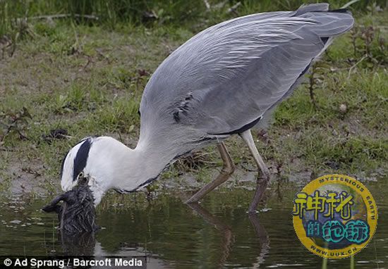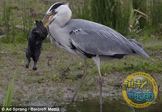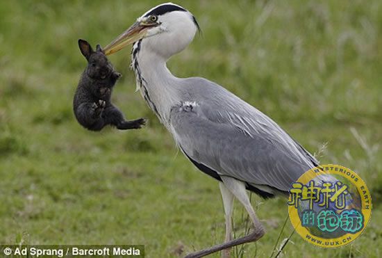 苍鹭主要以鱼类为食,偶尔也会捕食其它小鸟以及小型哺乳动物。不过英国一只苍鹭却捕食到了一只黑色的大兔子。