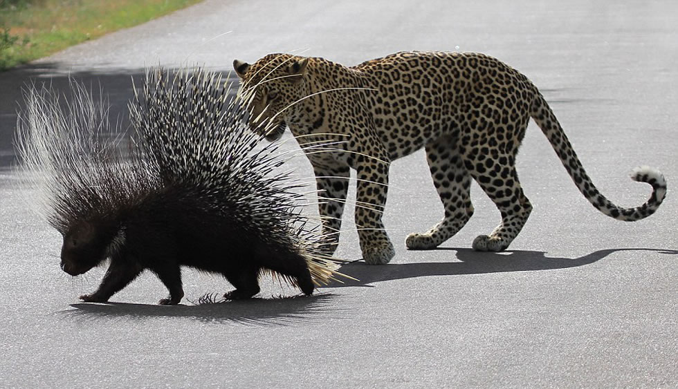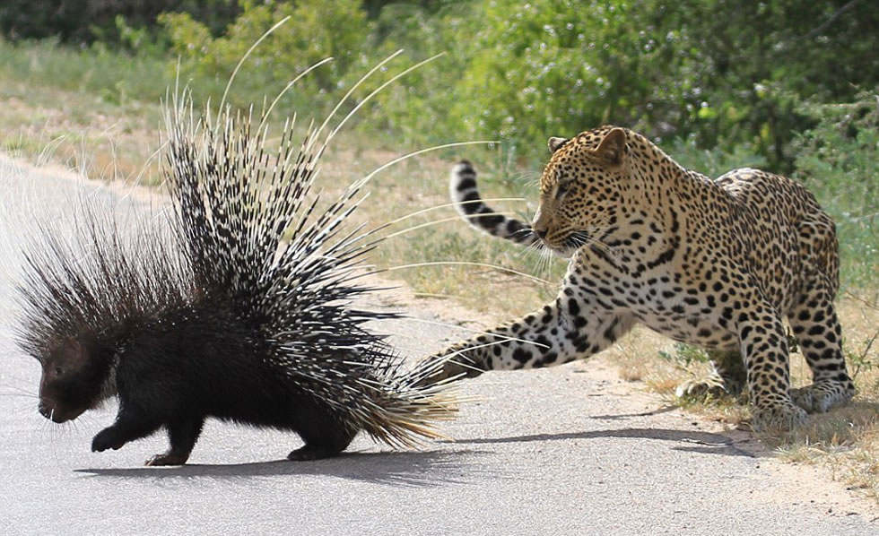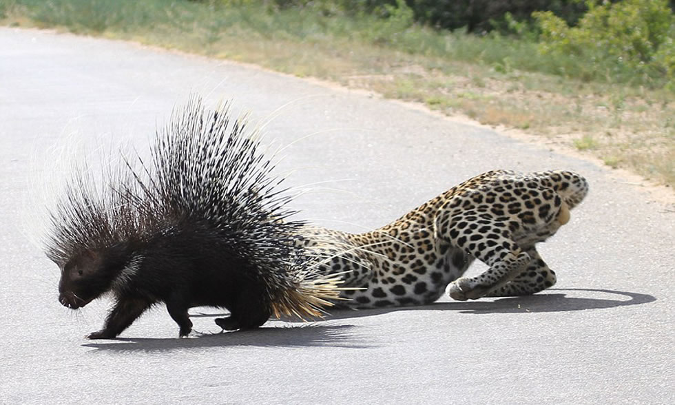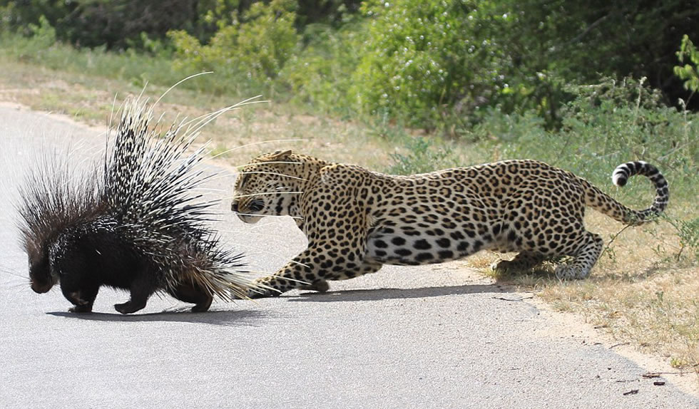 (神秘的地球报道)据国际在线(米粒):英国《每日邮报》2月26日报道,来自南非约翰内斯堡市的42岁男子优素福·凯伍昂斯(Yusuf Chavoos)近日驾车穿越南非克鲁格国家公园时,在马路上目睹了一只花豹欲捕食一只豪猪的画面。这只身长达1米多的凶猛花豹在移动缓慢的豪猪背后周旋很久,多次攻击都无从下口,反倒咬了一嘴的刺。