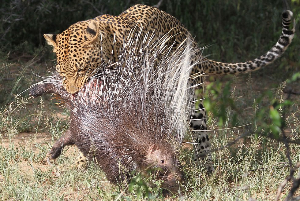 南非克鲁格国家公园内一只花豹试图捕食一只全身长刺的豪猪。
