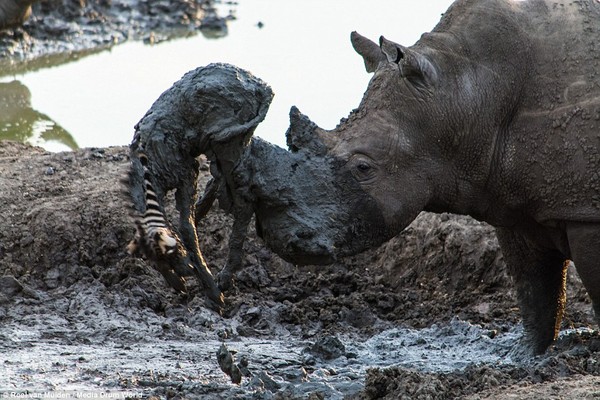 南非麦迪卡威禁猎区(Madikwe Game Reserve)一头犀牛试图营救一只陷在泥淖里、不停哭嚎的小斑马,不过,当它顺利把小斑马「勾」上岸后,却因为不小心挪动了位置,导致利角刺穿了小斑马柔软腹部,让它「肚破肠流」,当场惨死。整个过程都被导游导游谬登(Roel Van Muiden)纪录下来。