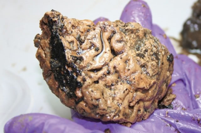 经布拉德福德大学(University of Bradford)考古学家证实,这些组织物是人类大脑。牙齿和头骨检验表明,头骨主人去世时年龄在26至45岁之间。而脊椎骨上的痕迹表明,他首先收到了颈部重击,之后被锋利的小刀割掉整个头部,但这只是猜测。专家之前也曾推测他曾经历绞刑,按照铁器时代的残忍法则,头部被作为战利品保留。