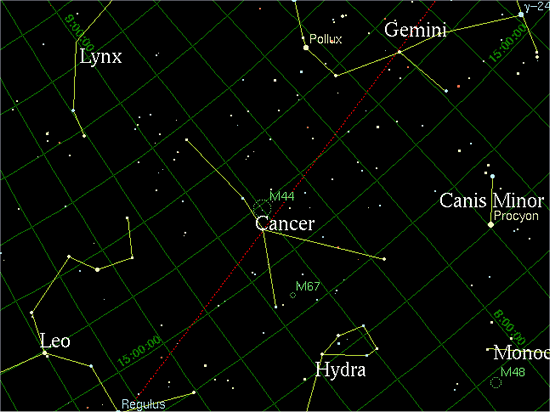 另一深空天体——M67是银河系最古老的星团之一,年龄超过十亿年。位于柳宿增三(α)以西,它是一个大而暗的疏散星团。