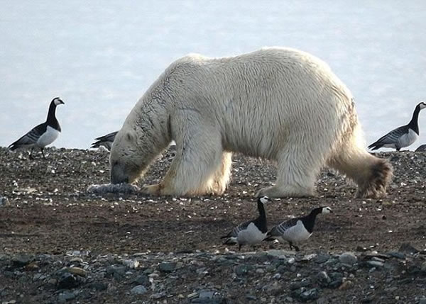北极熊到陆地觅食,专家忧虑影响生态平衡。