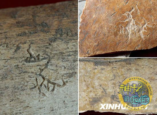 这是几片刻有图案符号的兽甲骨(拼版,资料照片)。