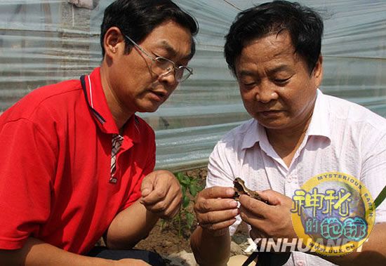 山东大学美术考古所所长、山东甲骨文学会副会长刘凤君(右)在研究肖广德(左)发现的兽甲骨图案文字(8月18日摄)。