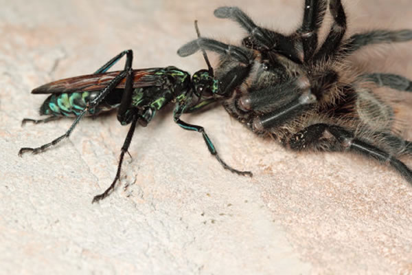 沙漠蛛蜂是一种非常聪明的寄生蜂,它们攻击捕鸟蛛而非人类。沙漠蛛蜂通过蜇刺使捕鸟蛛麻痹,然后把它们拖到洞穴内。沙漠蛛蜂会将卵产在捕鸟蛛体内,卵孵化成幼虫后以还活着的捕鸟蛛为食,整个过程会持续数周。