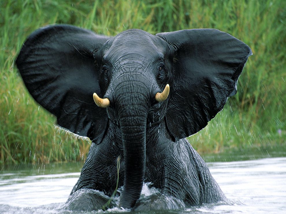 Cukrász和其他人原本以为河水比实际上要深了许多,因为在船驶近时,他们只看见大象的头和象鼻。 「这头公象突然从浅浅的水中站起来,并且跑向我们,」他写道,还说这是当时他拍摄的「最后一张照片」。(摄影:Szakács Cukrász,美国国家地理)