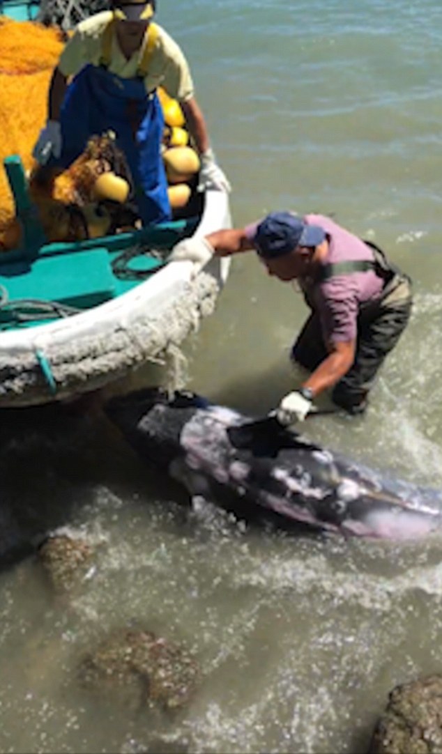 这是一只雄性的里氏海豚,这只海豚绕着岩石游动,明显已经失去了方向,看上去十分痛苦。随后赶来的渔民下船试图将海豚推回到深水里。海豚无精打采地在水里打转,看上去毫无活力,乘小船过来的渔民将海豚拖回到深水区。