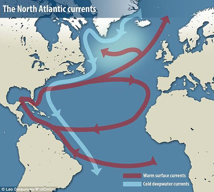 如果大西洋经向翻转环流出现异常,那么温暖的表面流就无法进入高纬度地区,短期内可造成某些地区更加寒冷,远期可影响北大西洋的气候