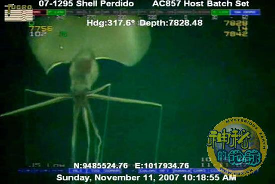 据英国《每日邮报》报道,在2.5公里的深海油井下,一台遥控的潜水摄像机拍到了惊人的一幕:一只怪异的长触角巨型鱿鱼(Magnapinna)出现在画面中。美国《国家地理》杂志最近公布了这段难得一见的影像。影像记载在2007年11月11日一只罕见的巨型鱿鱼(Magnapinna)闲荡在墨西哥海湾的海底上。