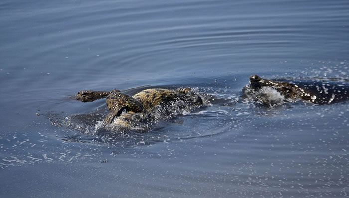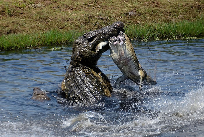 南非莱塔巴河大鳄鱼在河中发现幼年同类后发起野蛮袭击