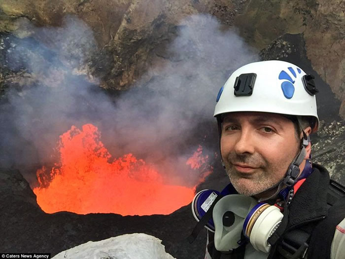 (神秘的地球报道)据环球网(实习编译:郭姗姗 ):英国《每日邮报》12月9日报道,45岁的美国男子尼科•哈利克(Nik Halik)在瓦努阿图的本博火山口留下了惊人的自拍。他不惧极端的高温和有毒气体,勇敢攀登至离火山口最近的点拍摄下自己的壮举。