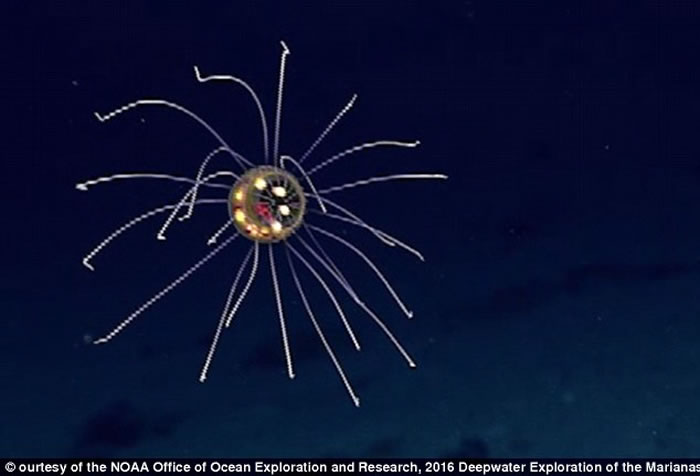 研究人员在马里亚纳海沟进行勘测活动,发现一种类似球状的水母新物种,此外还发现了六鳃鲨鱼和各种鱼类。