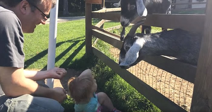该名女童跟随父亲一同在农场喂山羊,父亲教她将手弄成杯状,令手上的食物不会掉下。过了一段时间,女童终向右边的山羊喂食,但旁边另一只山羊疑等得不耐烦,一口咬向女童的头发。女童痛极坐在地上,状甚可怜,她其后怒视咬她头发的山羊,十分可爱。
