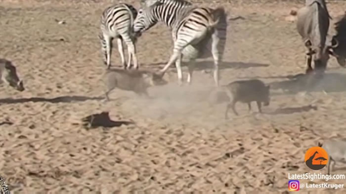 该只班马疑似忍不住野猪在身后扰攘,加上不想同类受到野猪骚扰,猛然提起后脚追踢两只野猪。两只身型细小的野猪当然抵不住这强烈一击,其中一只中腿倒地,站起后立即向不同方向逃去,影片亦以斑马群继续休息作结。