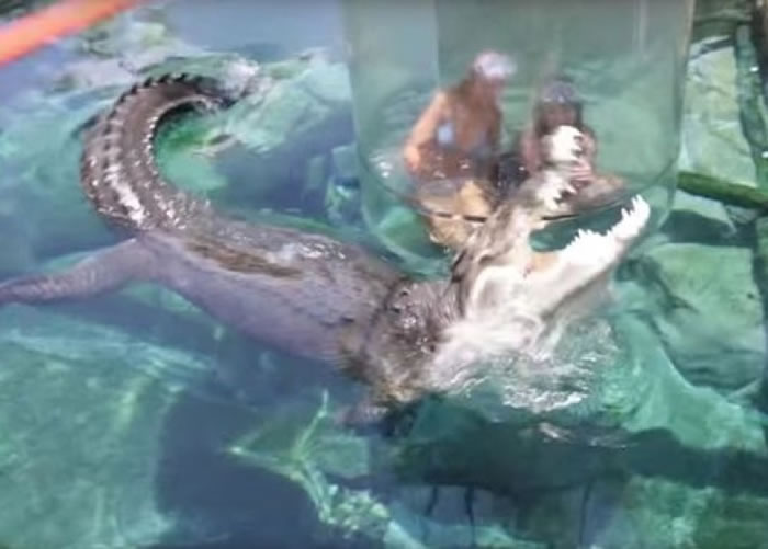 从片段可见,数名女游客兴致勃勃走进玻璃圆筒,当圆筒徐徐降进池中,她们就隔着玻璃跟鳄鱼互动,好不快乐。据悉该鳄鱼观赏池共有约200条鳄鱼,而亲亲鳄鱼体验每次为15分钟。据网页指,已有数以千计的游客作过此刺激体验。