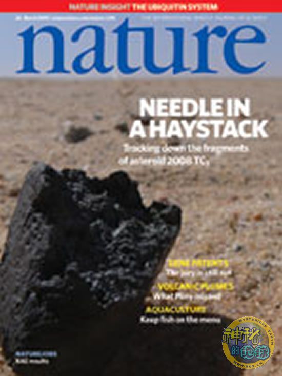 2008年10月6日,一个向地球方向飞来的名为“2008 TC3”的小行星被卡特里那巡天系统发现。在经过大约19小时、人们对其作了很多天文观测之后,它进入了地球大气层,并在37公里高度处解体。人们当时并未料到会有肉眼可见的较大碎片掉到地面,但沿着位于苏丹北部一个沙漠中的陨石触地轨迹所做的一项专门的搜索工作发现了47块陨石,它们是被命名为“Almahata Sitta”的一整块陨石裂成的碎片,总重量为3.95千克。该小行星及陨石的反射光谱表明,该陨石是来自一个F级小行星的表面物质,这类物质非常脆弱,以前没有出现在人们所收集的陨石中。收集到来自一个已知类别的小行星的陨石,是一个可与一次成功的飞船取样任务相媲美的成果,而且前者还不用发射火箭。本期封面所示为来自小行星“2008 TC3”的一个碎片,是被喀土穆大学的学生在其第三次搜索过程中于2008年3月1日发现时的现场情景。