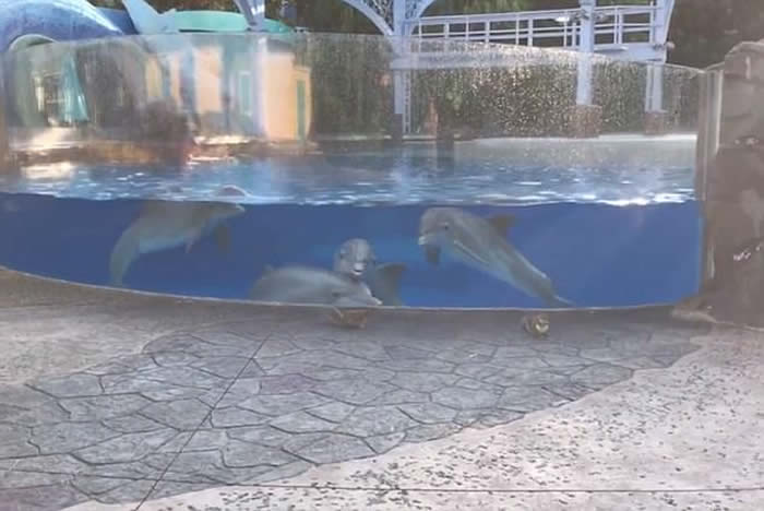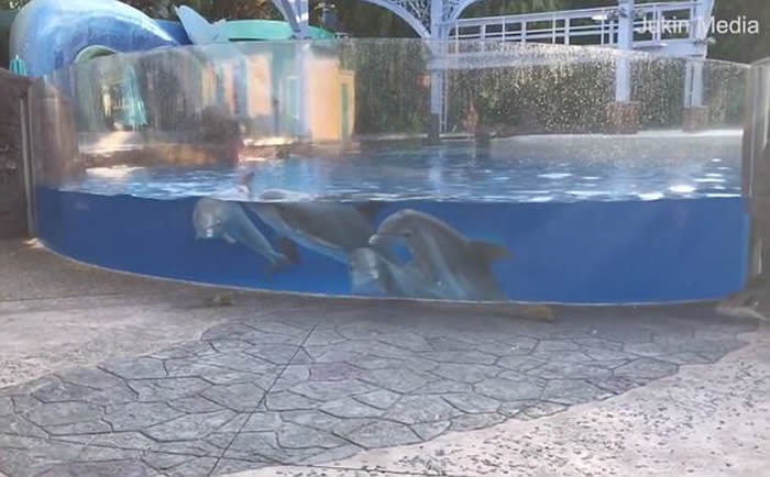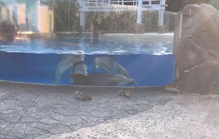 视频:美国佛州主题乐园“海洋世界”4条海豚被玻璃水箱外两只小松鼠吸引