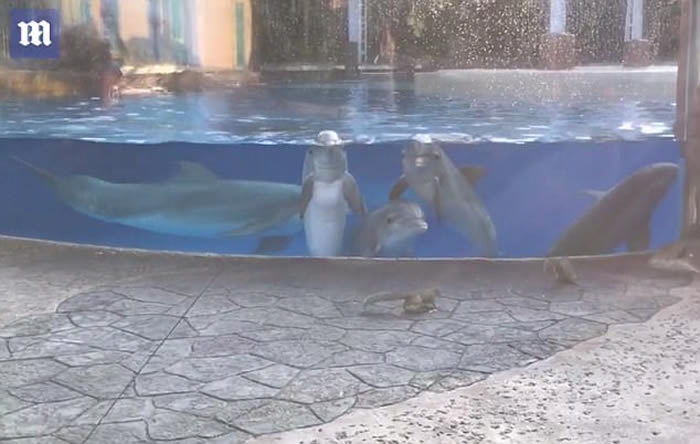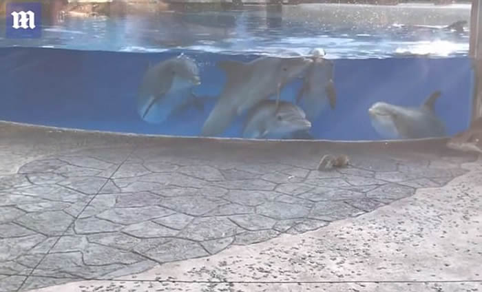 美国佛州主题乐园“海洋世界”4条海豚被玻璃水箱外两只小松鼠吸引