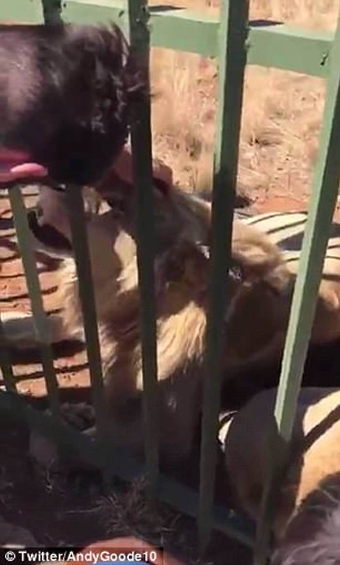 英国威尔斯国家榄球队队员在南非动物园伸手摸狮子头被咬