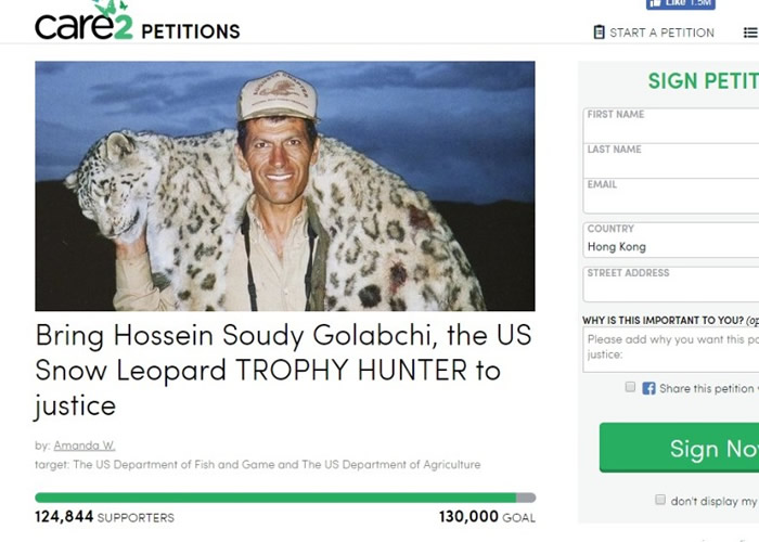 (神秘的地球uux.cn报道)据ETtoday:伊朗裔的美国建筑富商戈拉布基(Hossein Golabchi)于9年前在中亚地区猎杀一只「易危」动物雪豹,甚至抬起雪豹尸体拍照炫耀。国际濒危动物保护组织(TERA)于10月23日在网路上发起「将雪豹猎人绳之以法」活动,截至目前已有13万人支持。