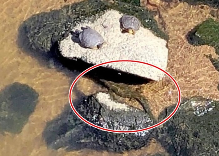 目击者拍下的其中一张相片,红圈内为该疑似鳄鱼在岸上晒太阳。