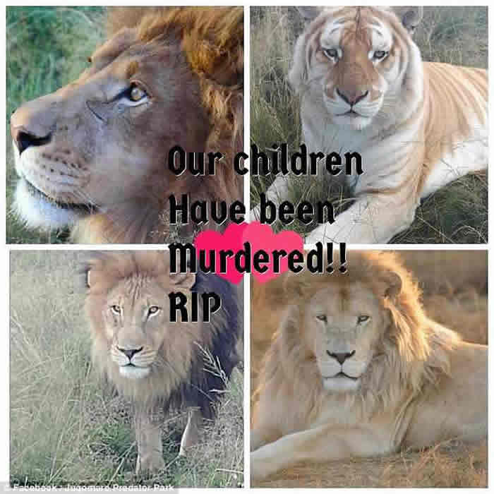(神秘的地球uux.cn报道)南非林波波省一个野生动物保护区近日有偷猎者,毒杀三只狮子和一只全球只有约30只的稀有黄金虎,企图把它们肢解用来制作“黑魔法药水”。保护区负责人发现后用人工呼吸抢救大猫不果,泪流满面悲呼:“我们的孩子遭谋杀了……”