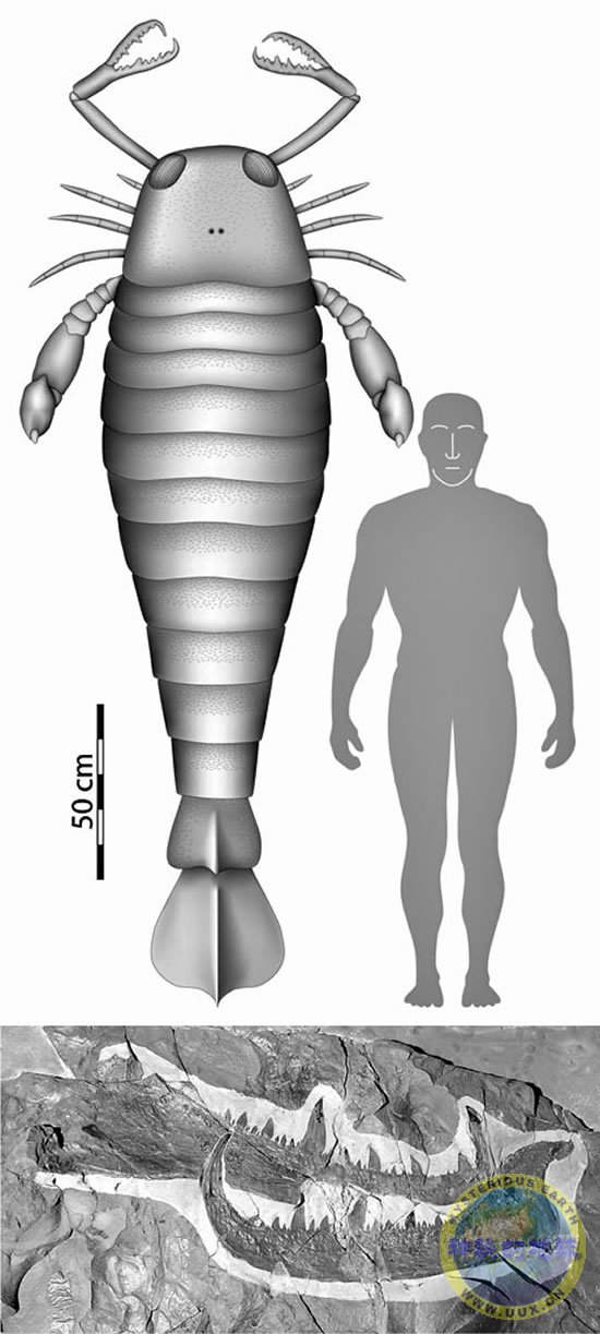 Scientists say this 18-inch (46-centimeter) fossil claw (bottom) belonged to the world's largest known bug: an 8.2-foot (2.5-meter), 390-million-year-old sea scorpion called Jaekelopterus rhenaniae.