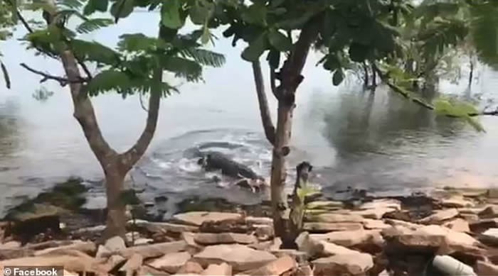 鳄鱼靠岸后一个猛扑,一口便咬住了白狗,迅速将其拖入水中,一旁的黑狗则幸运逃脱,影片中还可听到一名疑似是饲主的女子,在旁大叫希望狗狗能赶快上岸,附近则传出小孩子惊恐的尖叫声。
