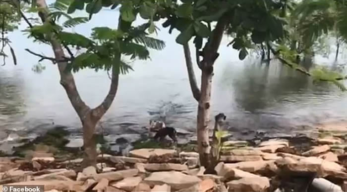 这起事件22日发生在Northern Peninsula区的一间州立小学附近,一名老师发现有两条狗狗正好在眼前玩耍,画面看起来十分幽静美丽,便用手机纪录下来,没想到远方却出现一条蠢蠢欲动的鳄鱼,缓缓向2条狗狗靠近,对它们设下死亡陷阱。