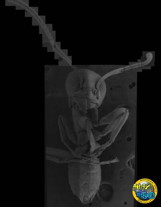 这张蚂蚁显微图片是由136张有电子显微镜拍得的照片拼起来的。(此为原图缩小后的图片)
