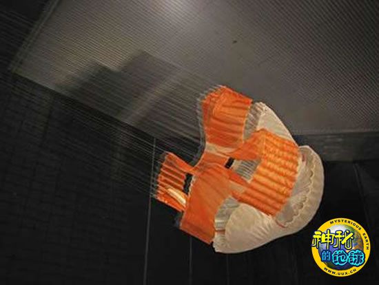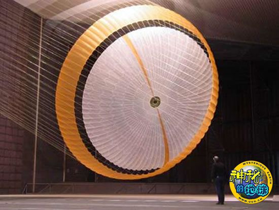 这个史上最大的太空降落伞是由先锋航空航天公司生产。为了检测其性能,科研人员在美国宇航局艾姆斯研究中心世界上最大的风洞对其进行实验。这个太空降落伞已经于2009年4月份通过了飞行测验,做好了为2011年发射“火星科学实验”“保驾护航”的准备。据悉,这个火星车太空降落伞接受测试的风洞有80英尺高(约24米),120英尺宽(约37米),足够装下一架波音737飞机。由较轻的尼龙和涤纶材料制成,这个太空降落伞的重量只有120磅,但却能产生足够大的拖拽力,可以达到65000磅(约29吨)。太空降落伞由80根悬挂索牵引,每根悬挂索长150英尺(约45米)。