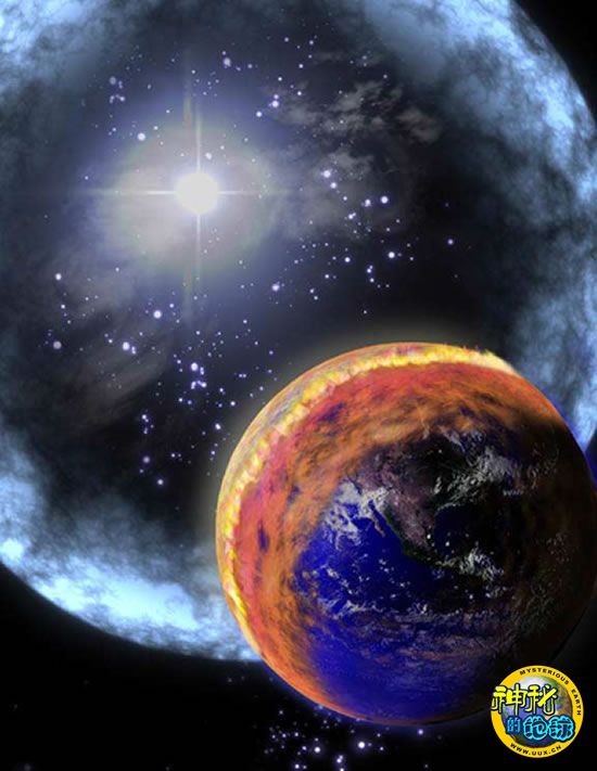 每个世纪我们的星系里都会有一两颗超新星发生爆炸。其中一颗将对我们的地球产生严重影响,它发生爆炸后,会对半径大约是10光年内的天体产生不利影响,而我们的地球正好处在这个范围内。超级超新星(hypernovae)发生爆炸波及的范围会更广。它的强度比常规超新星的强度大10倍。超级超新星是持续时间较长的伽马射线爆(GRBs)的主要来源。伽马射线爆是沿着死亡恒星的旋转轴释放出来的高能光束。伽马射线爆能传播到6500光年以外,可对地球造成严重破坏。