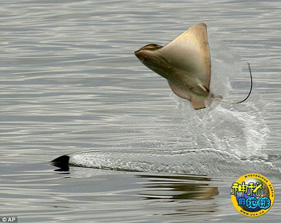这条黄貂鱼正想尽一切办法,试图避开素有深海“终极杀手”之称的逆戟鲸的追逐,而后者紧紧跟在黄貂鱼的身后,随时准备展开攻击,最终迫使黄貂鱼飞出水面。黄貂鱼似乎对藏身海底的生活极为满足,偶尔还用它们锐利的尖刺去袭击人类,而这张照片则表明,情急之下,黄貂鱼照样可以表演飞行绝技。