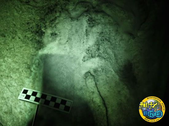 一个旧石器时代晚期壁画上的左手手印在夜视摄像头下发出绿光