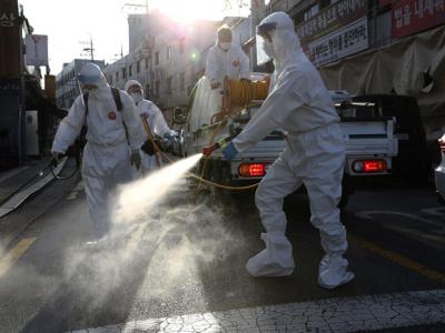 2020年10月6日韩国首尔,穿戴个人防护装备的消毒工人在清理一条街,以预防冠状病毒...