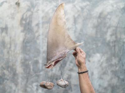 一片鱼翅绑上了石头,以便在干燥过程中维持形状。一项针对市面上鱼翅的新研究,惊讶...