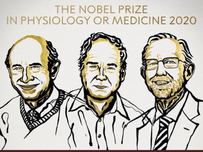 诺贝尔奖颁奖典礼改为线上直播,医学奖得主为阿尔特、霍顿、莱斯(左起)。(神秘的...