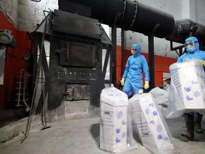 乌克兰基辅的工人将用过的医疗口罩和手套丢进焚化炉烧掉。 PH...