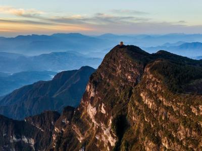 一座寺庙高踞在中国四川省的峨嵋山上。 周围乡间有「峨嵋山暗色岩」(Emeishan Tra...