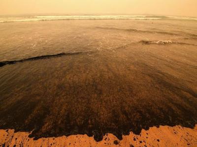 连续好几周,猛烈的野火产生的灰烬、煤烟和焦黑的植物,沿着澳洲新南韦尔斯(New S...