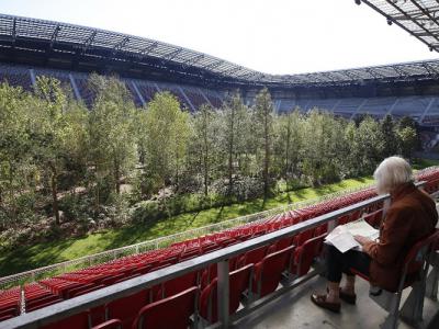 沃尔特湖足球场长出森林。壮观树林与观众席形成巨大对比。利特曼希望民众关注气候变...