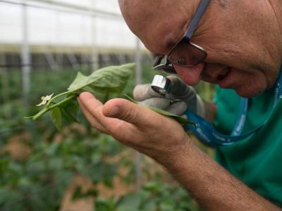 萨莫拉种植胡椒植物。螨虫在农作物上“工作”。阿梅里亚省东南部有一大片温室。(神...
